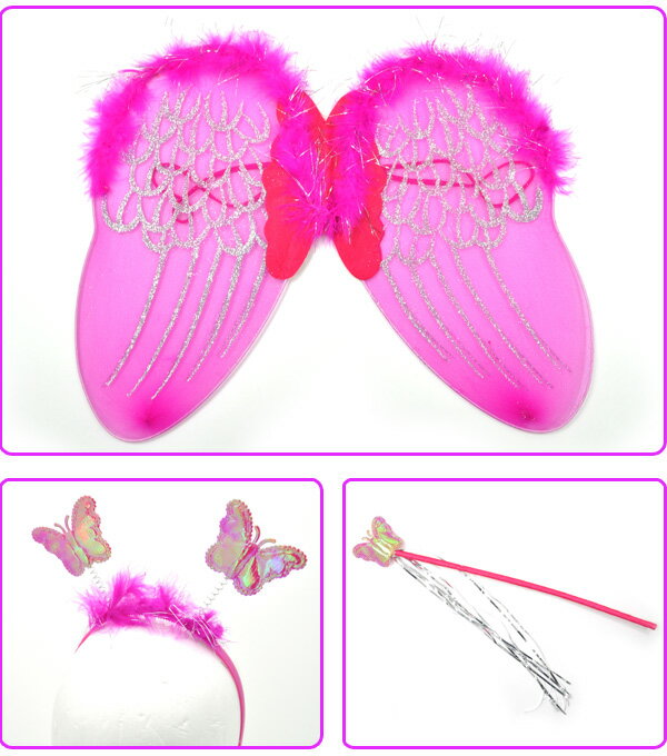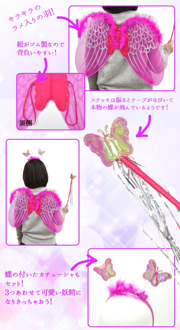 (メール便不可)カチューシャとステッキ付き!ファンシーな妖精の羽〜ピンク〜 パーティーや文化祭での仮装にもってこいの妖精の羽!ステッキと蝶が付いたカチューシャもセットなので簡単に仮装が楽しめます! 鮮やかなピンク色が人目を引いて目立つこと間違いなしです!! 製品仕様 サイズ(約) 羽:横48×縦39cmカチューシャ:横22.5×縦22cmステッキ:横36×5.8cm 素材 ラメ、ゴム紐、モール、PC 注意事項 ※強い衝撃を与えるとラメが取れる場合があります、あらかじめご了承ください。